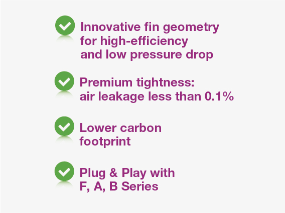 To reduce power consumption for cooling, the heat recovery unit can be incorporated into an indirect evaporative cooling system. For these applications, Recuperator has developed a new aluminium coating that improves system performance and ensures high resistance to corrosion. For further information, please see the B·Blue technical documentation.