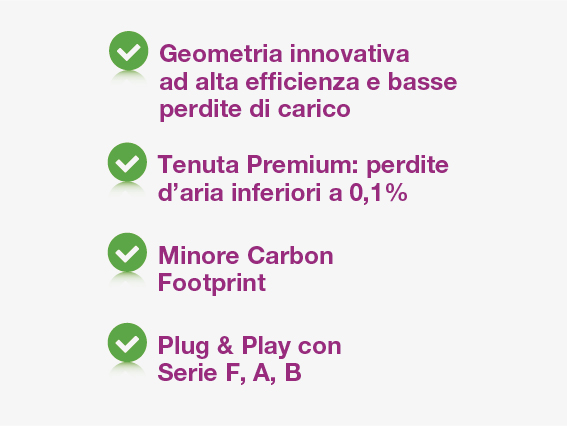 › Basse perdite di carico; ∆P consigliato 200 Pa.
